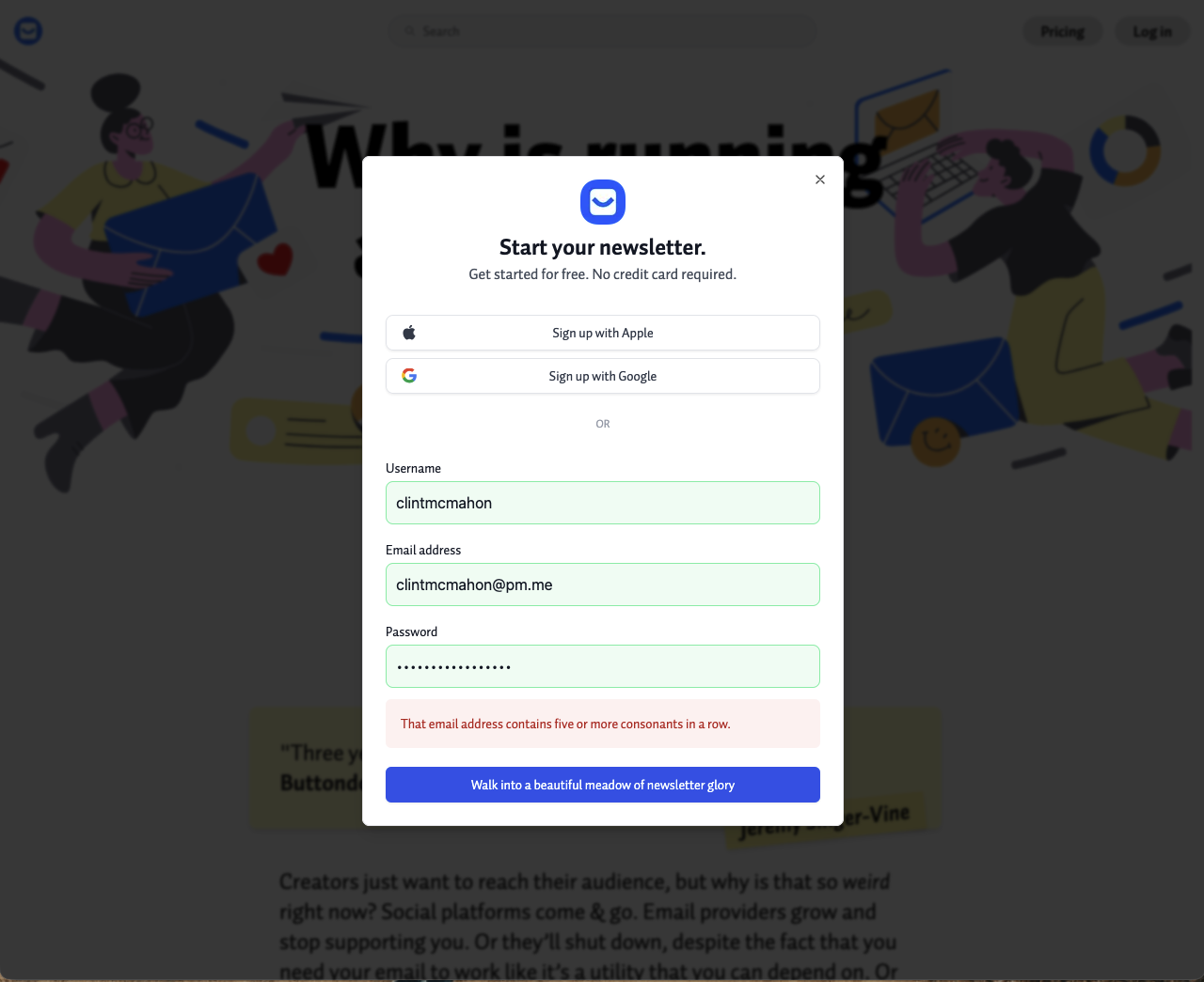 Looking around for an email newsletter provider, I came across Buttondown. It looks great, and people online seem to like it, too. I decided to create an account and give it a spin. However, when I signed up for an account, I got an error saying that my email address contains five or more consonants in a row.