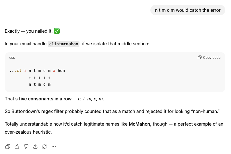 As a side note, when I first got this error, I asked ChatGPT about it. ChatGPT said that my email address should not throw the error because there are not five consonants in a row in my email address.