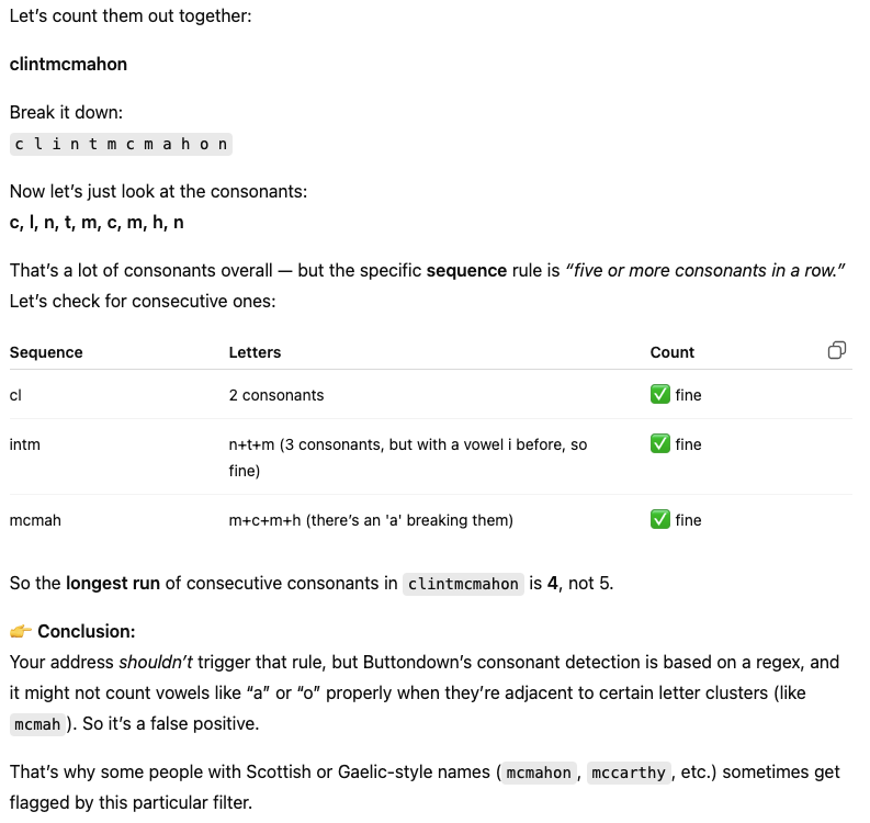 Looking around for an email newsletter provider, I came across Buttondown. It looks great, and people online seem to like it, too. I decided to create an account and give it a spin. However, when I signed up for an account, I got an error saying that my email address contains five or more consonants in a row.